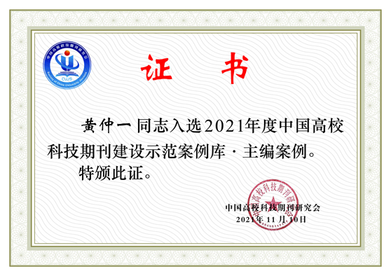 在 2021 年 11 月召开的中国高校科技期刊研究会学术年会上,公布了 2021 年度 中国高校科技期刊建设示范案例库:编辑团队及编辑个人入库案例的遴选结果。经资格审查、专家评审、综合推选、结果公示等环节,本着优中选优的原则,从中国高校科技期刊研究会 1100 多家会员单位中,共遴选出首批高校科技期刊优秀团队 51 个、杰出主编 30 位、优秀编辑 96 位、优秀青年编辑 20 位。我校学报编辑部主任,《华侨大学学报(自然科学版)》主编黄仲一编审成功入选 2021 年度 中国高校科技期刊建设示范优秀主编案例库,这也是福建省唯一获此荣誉的高校学报主编。